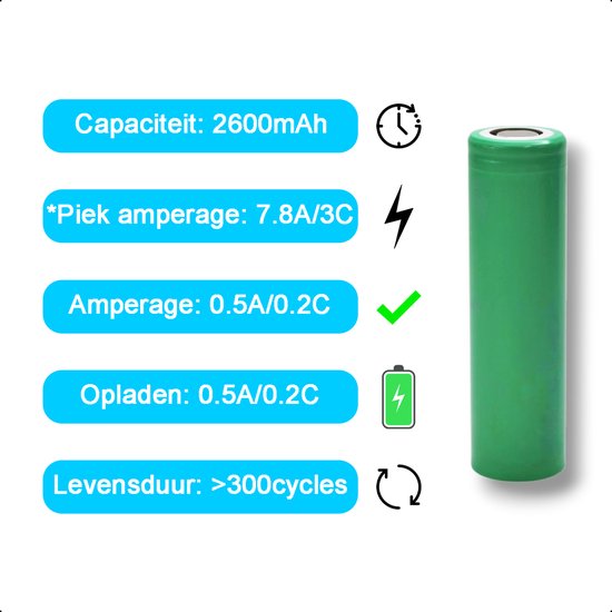 Avec un côté plus plat, des embouts de protection et d'excellentes spécifications, telles qu'un courant de décharge maximal de 7,8A et une durée de vie de plus de 300 cycles, vous êtes assuré d'une haute qualité. Choisissez la batterie Tech Essentials® 18650 fiable!