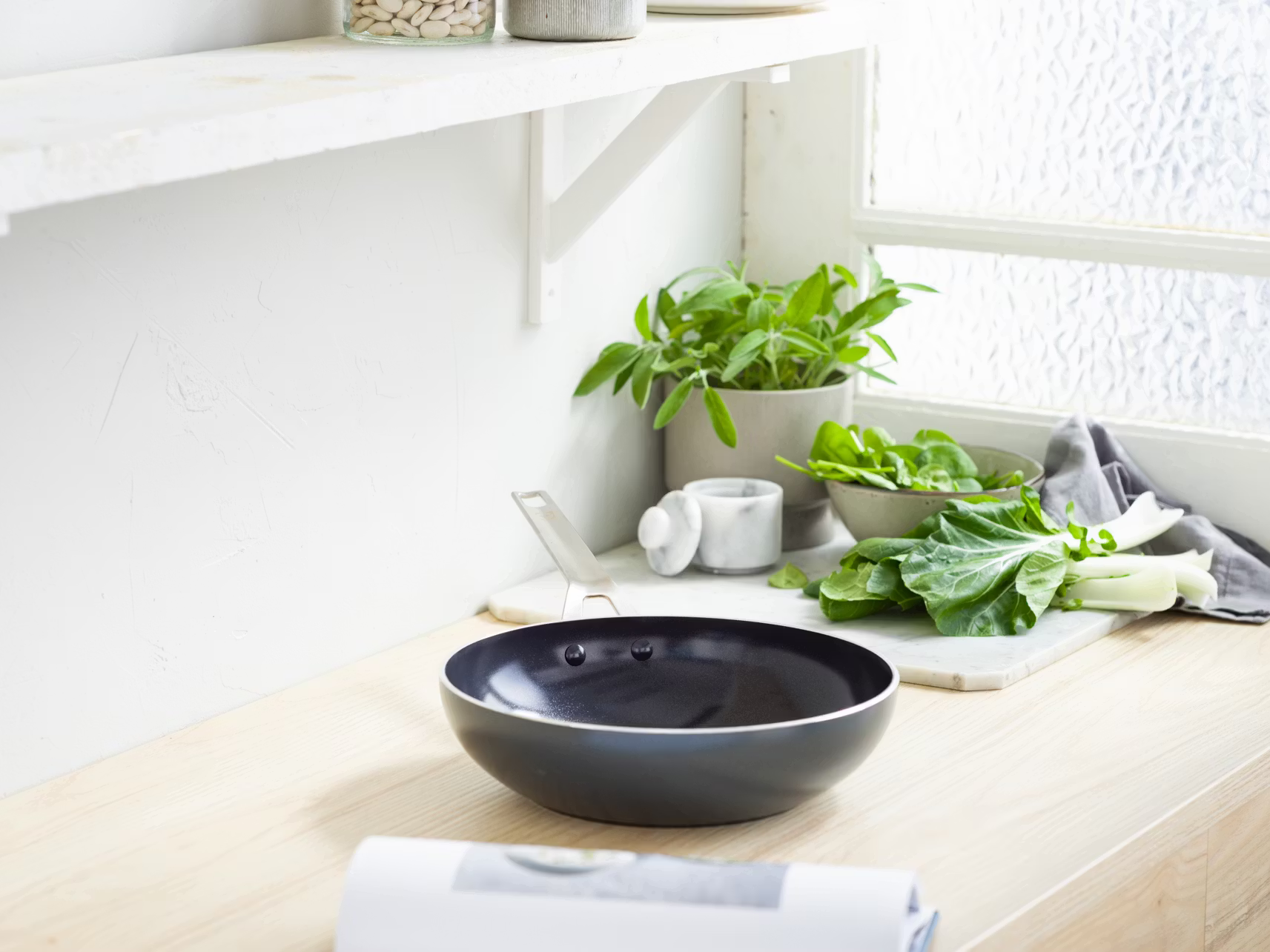 La poêle est fabriquée dans un matériau de haute qualité qui assure une répartition uniforme de la chaleur. Vous obtenez ainsi des résultats de cuisson parfaits à chaque fois. Grâce au revêtement antiadhésif durable, vous avez besoin de moins de graisse ou d'huile et le nettoyage est un jeu d'enfant.