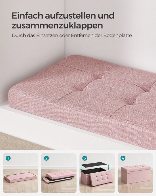 Tabouret polyvalent avec rangement de couleur rose pastel. Fabriqué en MDF, faux lin et mousse résiliente 25D, pour la durabilité et le confort. Avec une grande taille de 38 x 76 x 38 cm et un poids de 5,6 kg, il offre une capacité de charge statique maximale de 300 kg et une capacité spacieuse de 89 litres.