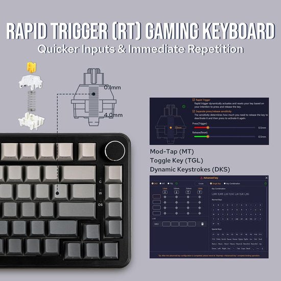 - Après le succès de l'AJAZZ AK820 MAX, AJAZZ lance l'AK820 MAX HE amélioré, équipé d'interrupteurs magnétiques lubrifiés en usine. Contrairement aux commutateurs mécaniques conventionnels, ces versions magnétiques offrent des capacités d'action rapide, ce qui se traduit par des temps de réponse ultra-rapides. Les utilisateurs peuvent activer les touches immédiatement après avoir appuyé dessus, sans avoir à attendre une réinitialisation complète. Le clavier offre plusieurs modes de changement de touche, notamment DKS (Dynamic Key Switching), MT (Magnetic Tactile) et TGL (Trigger-Lock), ce qui augmente la polyvalence.