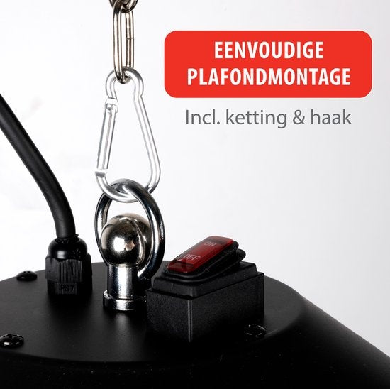 Les chauffages de terrasse vous permettent de vous asseoir dehors plus souvent et plus longtemps. Prolongez la saison extérieure et accrochez ce chauffage électrique de terrasse d'alpina au plafond de votre auvent ou de votre gazebo. Un tel chauffage électrique est moins cher qu'un chauffage au gaz, surtout avec l'augmentation du prix du gaz ces derniers mois, et chauffe plus précisément. Ce chauffage de terrasse rond avec chauffage infrarouge et télécommande a une puissance de 1500 watts et convient pour des surfaces de 12 à 18 m². Il se commande à l'aide du bouton situé sur le dessus et de la télécommande fournie. Dès que vous allumez le chauffage électrique, vous sentez la température monter rapidement. Ce chauffage de terrasse fonctionne à l'infrarouge et contient une lampe halogène qui dégage instantanément de la chaleur. Le chauffage de terrasse est suspendu au plafond. Le chauffage de terrasse est accompagné d'un kit de montage composé d'une chaîne d'une longueur d'environ 55 centimètres et de deux mousquetons, qui permettent d'accrocher la lampe à la chaîne. En fonction du point d'encliquetage, vous pouvez faire varier légèrement la hauteur de la lampe. Un tel chauffage suspendu est pratique, car il ne prend pas de place au sol. La lampe a un diamètre d'environ 42,5 centimètres et une hauteur d'environ 25 centimètres. Protégé contre l'humidité Le chauffage a une protection IP44, ce qui signifie qu'il est à l'abri des éclaboussures. Il résiste donc très bien à l'humidité et peut être utilisé à l'extérieur, dans des endroits couverts, par exemple sous un auvent. Le chauffage est également protégé contre la surchauffe. Spécifications alpina Terrace Heater Hanging with Remote Control 1500W Puissante lampe chauffante de 1500 Watts Montage facile au plafond grâce à la chaîne et au crochet en métal inclus Longueur de la chaîne : approx. 55 cm Télécommande incluse (fonctionne avec 2x piles AAA, non incluses) Elément chauffant halogène pour une chaleur directe Boîtier robuste en aluminium Surface chauffée 12-18 m2 Etanche IP44 Poids net : environ 2,3 kg Dimensions du produit : Ø 42,5 x 12,5 CM Longueur du cordon : environ 1,8 mètres Protection contre la surchauffe Approuvé CE par SGS Modèle : GS 1500