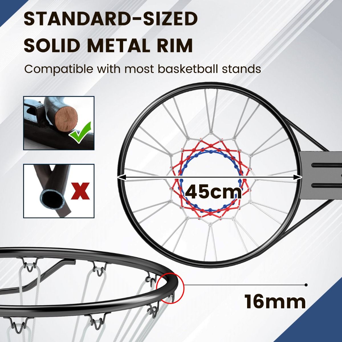 .Apportez le plaisir du basket-ball dans votre environnement domestique avec cet anneau de basket-ball robuste et résistant aux intempéries. Avec un diamètre intérieur standard de 45 cm, cet anneau convient à presque tous les supports de basket-ball et offre une expérience de jeu authentique pour une utilisation récréative et compétitive. Grâce à son cadre métallique solide enduit de poudre et à son filet en polyester durable, ce cercle peut résister à un usage intensif et à toutes les conditions météorologiques.