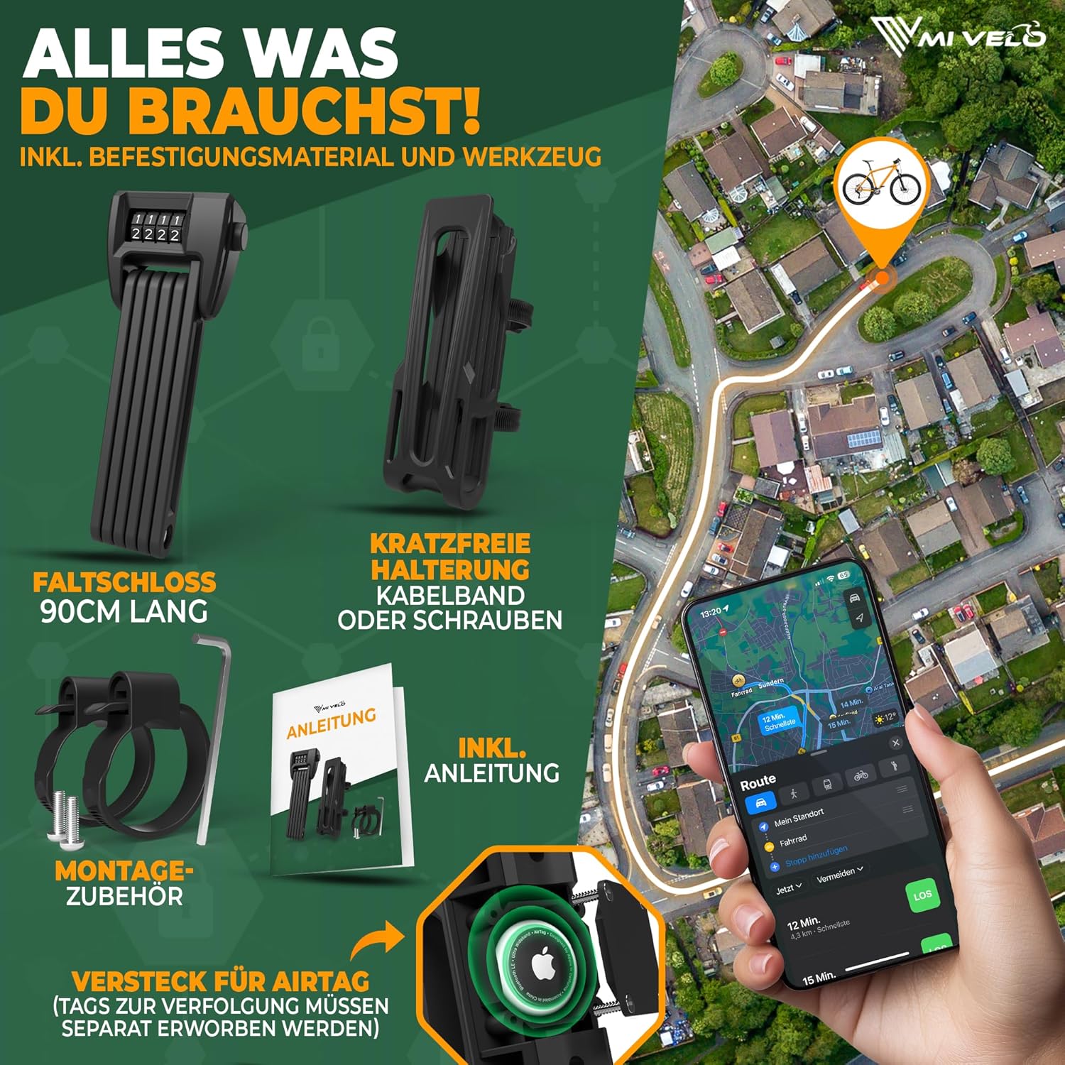Antivol à code pour vélo MIVELO - pliable - avec compartiment secret pour AirTags - 90 cm de long - acier robuste - 19,5 x 7 x 4 cm