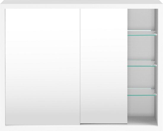 Une élégante armoire à pharmacie blanche avec miroir et portes coulissantes. Cette armoire fonctionnelle est parfaite pour une utilisation dans la salle de bain ou les toilettes, au-dessus de votre lavabo. Elle comporte trois étagères en verre transparent d'une profondeur d'environ 10 cm. Vous pouvez retirer une ou plusieurs étagères pour créer plus d'espace pour des objets plus grands. L'armoire est équipée d'un panneau arrière robuste et de deux portes coulissantes. Les dimensions de l'armoire sont de 50 cm de large, 40 cm de haut et 14 cm de profondeur, avec des étagères en verre de 50 cm de large et 10 cm de profondeur. La livraison comprend des instructions de montage détaillées et le matériel de fixation nécessaire.