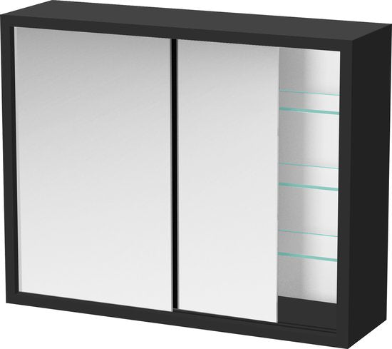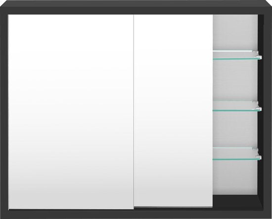 Une armoire à pharmacie noire avec miroir et portes coulissantes. Parfaite et pratique pour une utilisation dans la salle de bain ou les toilettes au-dessus de votre lavabo. Cette armoire de toilette contient 3 étagères en verre qui sont transparentes et d'une profondeur d'environ 10 cm. Pour obtenir plus d'espace entre les étagères et placer des objets plus hauts, une ou plusieurs étagères peuvent être facilement retirées. L'armoire est dotée d'un panneau arrière robuste et de 2 portes coulissantes. Les dimensions totales sont de 50 cm de large, 40 cm de haut et 14 cm de profondeur. Les étagères en verre mesurent 50 cm de largeur et 10 cm de profondeur. La livraison comprend les pièces, y compris les instructions de montage et le matériel de fixation.