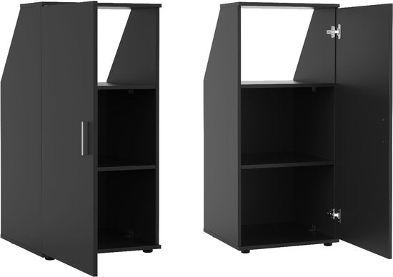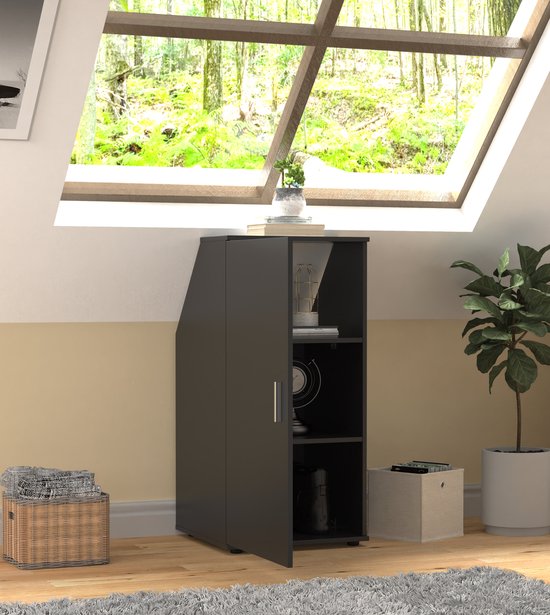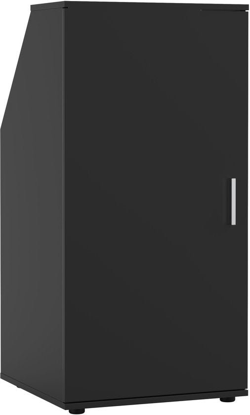 Armoire de rangement noire fonctionnelle pour les vêtements dans les pièces avec des murs inclinés - idéale pour tirer le meilleur parti de l'espace sous un toit incliné ou une lucarne. Cette armoire polyvalente est conçue pour être placée contre un mur incliné, sous un toit en pente ou une lucarne, ou dans un angle incliné. Pratique et multifonctionnelle pour les greniers, les chambres à coucher, les bureaux ou les chambres d'étudiants où l'espace doit être utilisé efficacement. Avec un angle d'inclinaison intelligent d'environ 45 degrés et une hauteur d'environ 68 cm, cette armoire s'adapte parfaitement à de nombreuses pièces standard. Dimensions : largeur : 50 cm x hauteur : 100 cm + 2,5 cm de pieds x profondeur : 50 cm. Pour toutes les dimensions, veuillez consulter le dessin de spécification dans l'annonce.