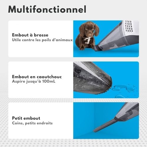 Vous pouvez utiliser l'aspirateur pour les saletés sèches et humides. Nous fournissons à cet effet un accessoire en caoutchouc unique. Ainsi, le liquide ne reste pas coincé dans les poils. Vous ne pouvez pas aspirer plus de 100 ml de liquide.