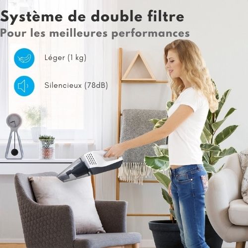L'air sortant d'un aspirateur sent parfois le renfermé. Notre aspirateur à main contient un filtre HEPA supplémentaire en plus du filtre grossier. Il retient 99,9 % des petites particules pour éviter la propagation des bactéries en suspension dans l'air. Vous pouvez nettoyer ce filtre manuellement. Votre santé étant très importante, nous fournissons gratuitement un deuxième filtre HEPA.
