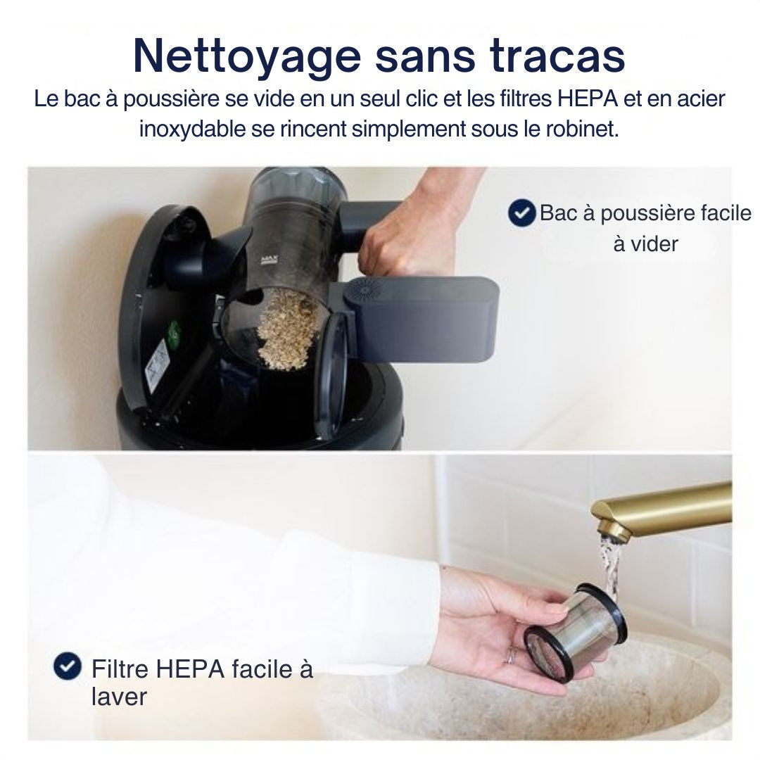 La batterie lithium performante permet d’aspirer toute votre habitation sans interruption. Vous profitez d’une liberté totale de mouvement pour nettoyer sols, tapis, meubles et coins difficiles d’accès.