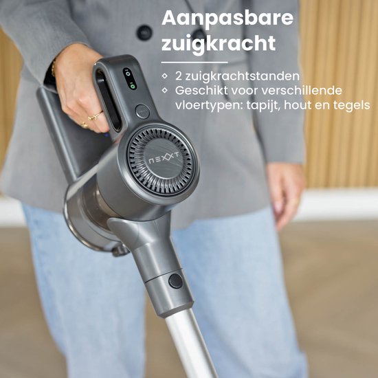 Avec l'aspirateur Nexxt, vous pouvez facilement ajuster l'aspiration pour obtenir des résultats optimaux. Cet aspirateur est donc idéal pour les ménages ayant différents types de sols et pour éliminer efficacement tous les types de saletés, des petites particules de poussière aux salissures plus importantes.