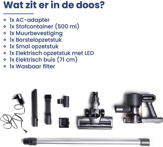 L'aspirateur-balai sans fil Nexxt est livré comme un ensemble complet, comprenant tous les accessoires nécessaires pour un nettoyage en profondeur. Cela comprend un accessoire électrique avec lumière LED pour une meilleure visibilité dans les coins sombres, un accessoire brosse pour les surfaces délicates et un accessoire étroit pour les zones difficiles à atteindre.Véritable rangement avec un support mural. L'adaptateur secteur inclus permet de recharger facilement l'aspirateur, et le filtre lavable garantit un fonctionnement durable de l'appareil.