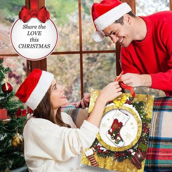 Assortiment de 12 sacs cadeaux de Noël avec poignées en corde et étiquettes cadeaux assorties - 4 grands (31 x 40 cm), 4 moyens (26 x 32 cm) et 4 petits (18 x 24 cm)