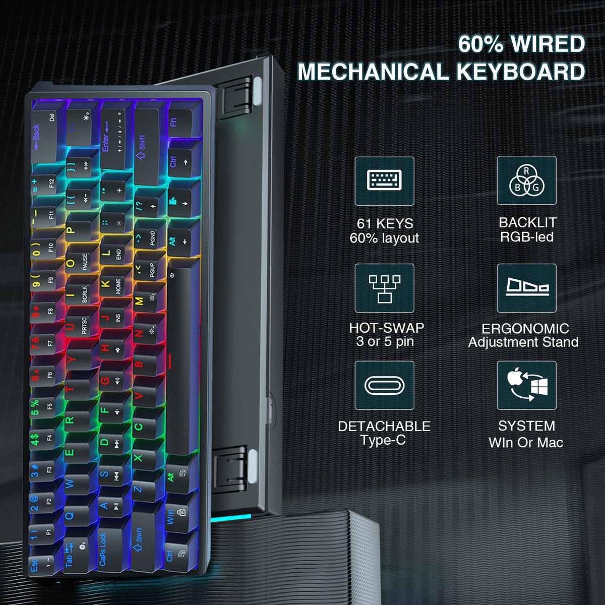 AULA F3261 - Clavier de jeu filaire - Mécanique - Full RGB - 61 touches - Commutateur rouge - Hot swap - Claviers Qwerty - Noir