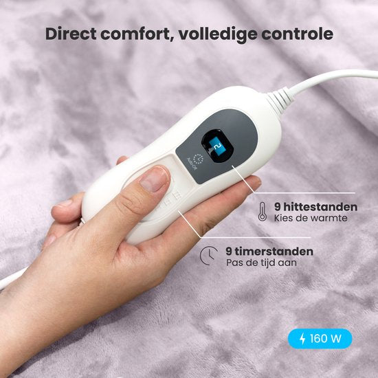 Cette couverture électrique dispose de trois réglages de chaleur différents qui sont faciles à contrôler à l'aide du panneau de commande. Les réglages sont clairement visibles sur l'écran LED éclairé. En outre, la couverture est protégée contre la surchauffe et s'éteint automatiquement après 180 minutes.