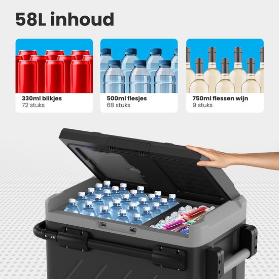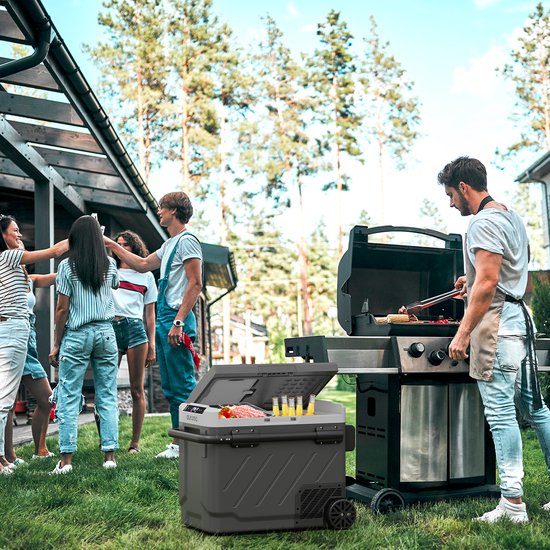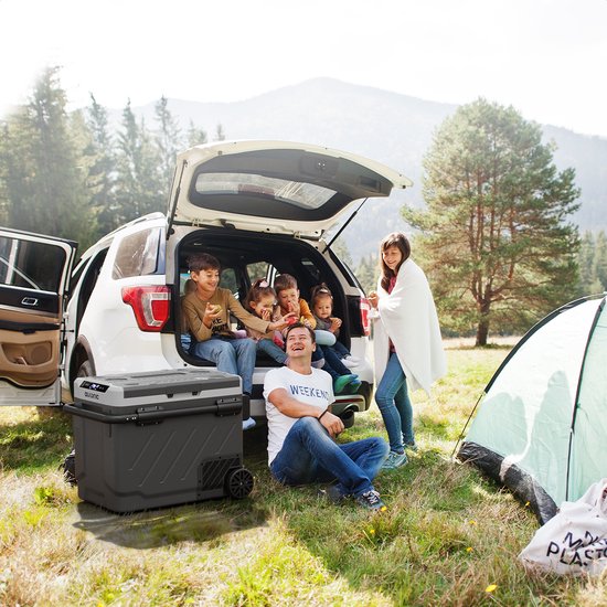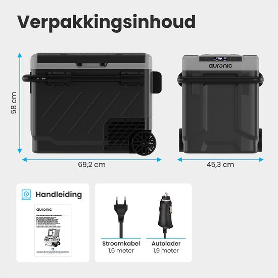 La glacière à compresseur électrique Auronic n'est pas seulement efficace, mais aussi très pratique et élégante. Grâce aux grandes roues robustes et à la poignée télescopique qui s'étend jusqu'à 90 cm, vous pouvez l'emporter facilement partout. Que vous alliez à la plage, en balade en bateau ou que vous ayez simplement besoin d'un espace de refroidissement supplémentaire dans votre garage. La glacière a une capacité de 58L. Son design robuste, fabriqué en matériau résistant aux rayures, garantit que cette glacière est résistante aux chocs. De plus, la règle sur le couvercle constitue un outil pratique pour les pêcheurs, et avec les deux porte-gobelets, vous avez toujours un endroit pour votre boisson.s.Plus que du refroidissement