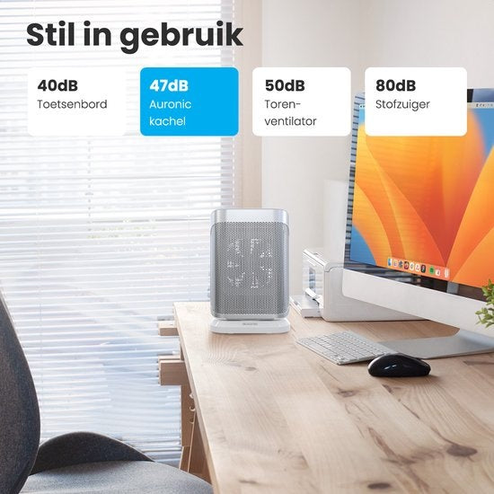 De lichtgewicht heater zorgt met zijn stille werking van slechts 47 dB (stiller dan een rustig gesprek) dat je ongestoord kunt focussen op je werk of kunt ontspannen in alle rust. Zo creëer je een rustige omgeving, of je nu een belangrijk project afrondt of geniet van een welverdiend moment van ontspanning.