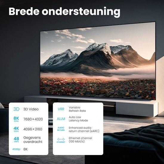 La toute dernière technologie HDMI 2.1 prend en charge jusqu'à 48 Gbps. On peut comparer le câble à un tube dans lequel une quantité limitée de données peut passer , l'ancien câble HDMI 2.0, par exemple, ne prend en charge que 18 Gbps. Avec le câble HDMI 2.1 d'Auronic, vous triplez presque la bande passante et le câble peut traiter beaucoup plus de données. Vous pouvez donc profiter de la meilleure expérience d'image et de son avec la 3D, le 10K à 30 Hz, le 8K à 60 Hz, le 4K à 120 Hz et la prise en charge du 4320P. En bref, la norme 2.1 offre encore plus de possibilités en matière d'audio et de vidéo !