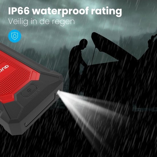 Le jumpstarter est étanche à l'eau et à la poussière. Même sous une pluie battante, le powerbank fonctionne correctement. Grâce à son boîtier robuste, le powerbank peut facilement résister à des chocs violents.