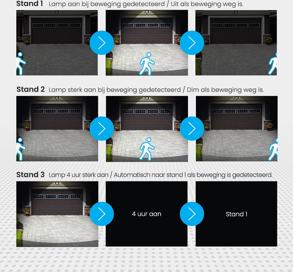 - Dès qu'une personne entre dans le champ de détection, la lumière s'allume. Dès que la personne a quitté le champ de détection, la lumière passe en feux de croisement.