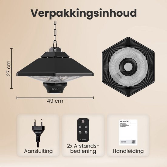 Auronic Terrace Heater - Chauffage infrarouge - Suspendu - 20m2 - Electrique - 2000W - Télécommande - 3 niveaux - Noir
