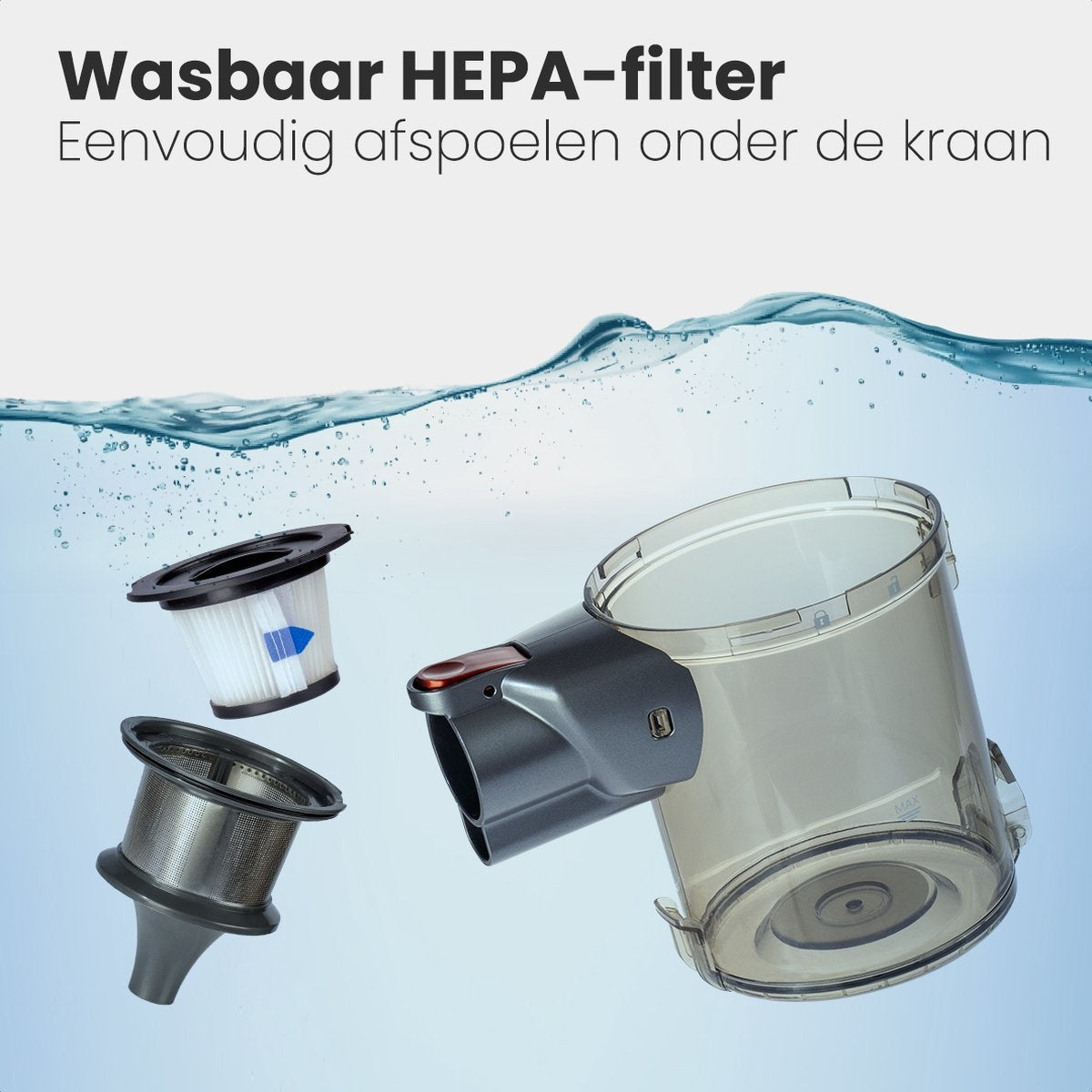 Avec son réservoir de 0,5 litre vidé en un clin d'œil grâce à son bouton de vidange facile, et son filtre HEPA lavable à la main, vous n'avez plus besoin de sacs poubelles.