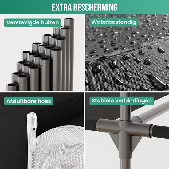 L'armoire pliable peut être facilement montée et démontée à nouveau. C'est parfait lorsque vous ne voulez pas perdre de temps ou que vous n'avez besoin de l'armoire que temporairement ! Aucun outil n'est nécessaire : il suffit de raccorder les tubes et de placer la housse en tissu autour. Super