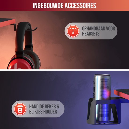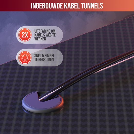 Avec un cadre métallique robuste et un plateau en carbone épais, ce bureau constitue une base solide pour votre installation de jeu. Des accessoires pratiques, tels que le crochet pour casque et le porte-gobelet, vous aident à garder votre bureau en ordre. La surface spacieuse offre suffisamment d'espace pour votre moniteur, votre clavier, votre souris et d'autres accessoires.
