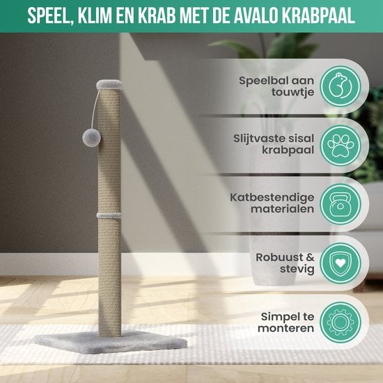 Les chats ont besoin d'aiguiser leurs ongles. Il est important que les griffes ne deviennent pas trop longues et qu'elles restent tranchantes, ce qui est bon pour la santé des griffes et de votre chat. C'est pourquoi vous avez besoin d'un griffoir. Installez-vous ce griffoir d'Avalo pour votre chat ? Si c'est le cas, il présente de nombreux autres avantages. Un griffoir contribue au maintien d'un poids sain, les chats peuvent délimiter leur territoire, vos meubles risquent moins d'être endommagés et les comportements indésirables des chats peuvent diminuer, voire disparaître.