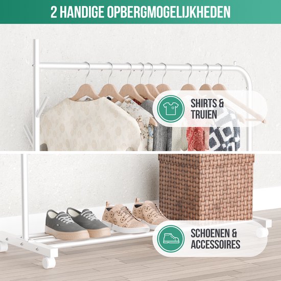 Ce porte-vêtements offre non seulement de l'espace pour les vêtements, mais dispose également d'une étagère à chaussures intégrée qui offre un espace de rangement supplémentaire. Ce support est parfait pour les chaussures ou d'autres accessoires, tels que les sacs et les boîtes de rangement, ce qui le rend idéal pour un couloir propre et ordonné.