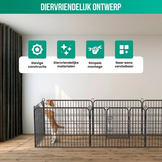 Le parc pour animaux/parc à chiots Avalo est inoxydable et fabriqué en métal de haute qualité avec des panneaux en fil d'acier épaissi et un double revêtement. Par conséquent, le parc est également inoxydable et peut donc être utilisé à l'extérieur sans problème.