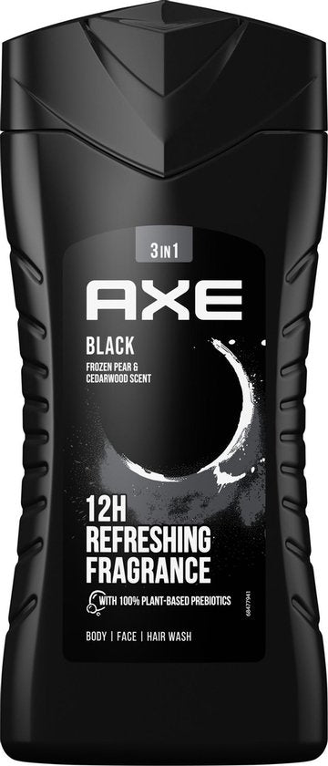 - Le gel douche 3-en-1 AXE Black convient au corps, au visage et aux cheveux .