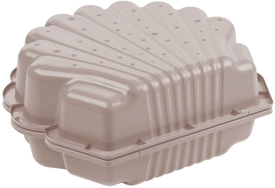 Un bac à sable amusant en plastique, composé de 2 parties en forme de coquillage. Ce bac à sable a une couleur rose clair pastel.