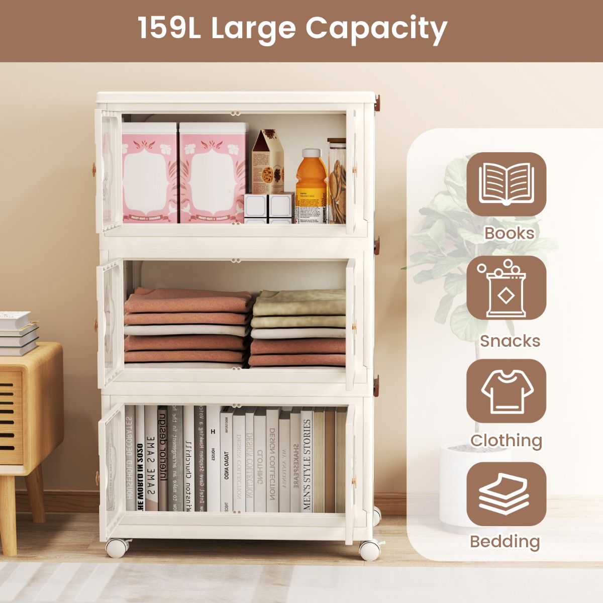 Pour une flexibilité optimale, la poubelle est équipée de quatre roues flexibles, dont deux sont verrouillables. Vous pourrez ainsi déplacer la corbeille sans effort dans la pièce et la sécuriser tout aussi facilement lorsque vous en aurez besoin. Cet organisateur est idéal pour les vêtements, la literie, les jouets, les ustensiles de cuisine, les livres, les articles saisonniers et bien plus encore.