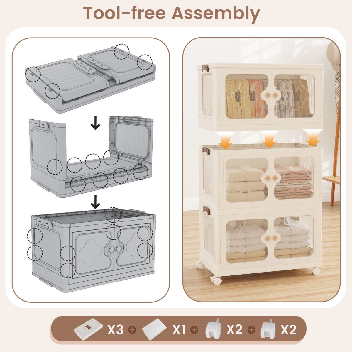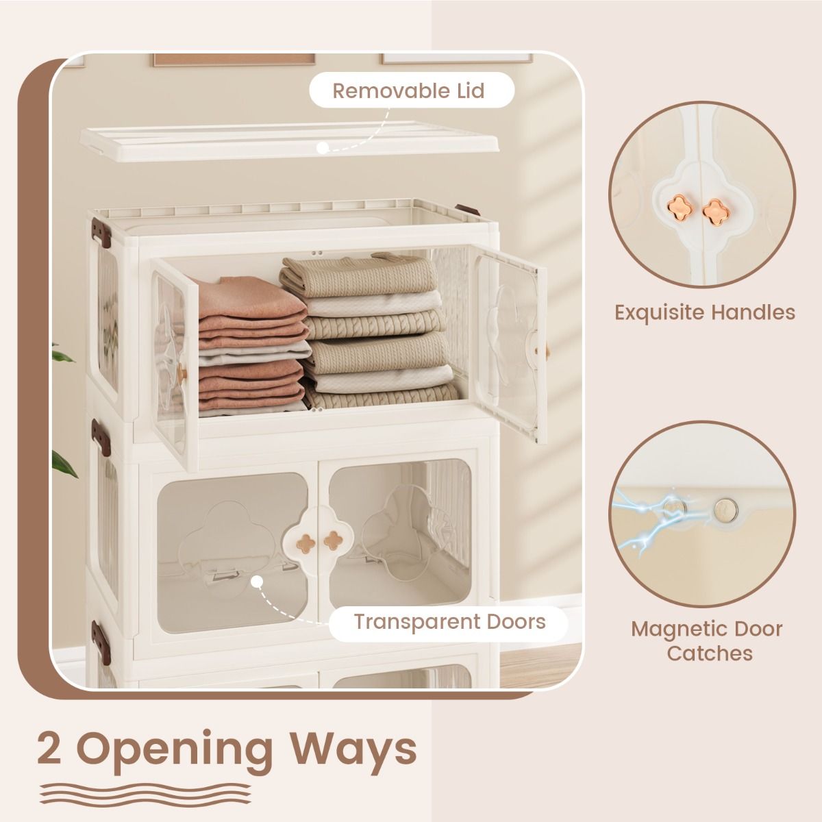 La combinaison d'un couvercle amovible et de portes frontales transparentes vous permet d'accéder à vos affaires de deux côtés. Les fermetures magnétiques et les poignées élégantes en forme de trèfle garantissent que tout reste bien rangé et en sécurité.