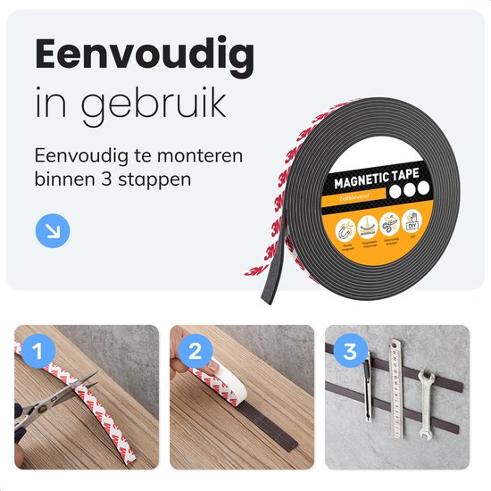 Veillez à bien nettoyer la surface avant d'appliquer la bande.gt pour une adhérence optimale. Coupez la bande à la bonne taille et fixez-la fermement à l'endroit souhaité. Utilisez le côté magnétique pour fixer de petits objets métalliques tels que des trombones, des vis ou des clés.