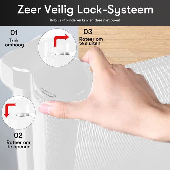 La barrière d'escalier Sweet Sprout est conçue avec une hauteur qui empêche les enfants ou les animaux domestiques de l'escalader. La barrière d'escalier est fabriquée dans un matériau de haute qualité et dispose d'un mécanisme de verrouillage. Activez ce verrouillage chaque fois que vous utilisez la barrière d'escalier. De cette manière, la barrière d'escalier ne peut pas se détacher facilement.