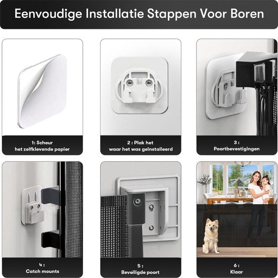 La barrière d'escalier Sweet Sprout est facile à installer.Utilisez le kit de montage fourni pour installer la barrière d'escalier. Vous pouvez fixer la barrière d'escalier à l'aide de vis, ce qui garantit une installation optimale et une sécurité accrue. En outre, la barrière d'escalier peut également être installée sans perçage, grâce à la fonction d'autocollant. Cette fonction garantit une fixation solide sans avoir à percer de trous. Nous recommandons cette option uniquement pour les animaux domestiques et pas pour les jeunes enfants. En outre, ne fixez jamais la barrière d'escalier en haut des marches!
