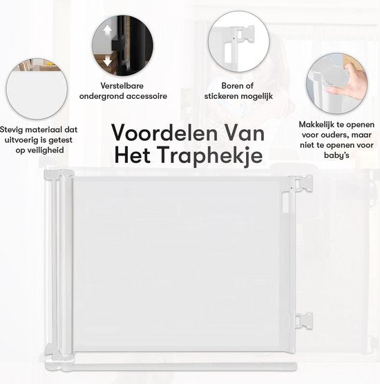 Barrière d'escalier enroulable avec fonction autocollante - Barrière de sécurité - Réglable - Barrière pour chien - Barrière d'escalier sans perçage - Barrière pour enfant - Pour animaux et enfants - 10 à 150 cm de large - Blanc - Sweet Sprout