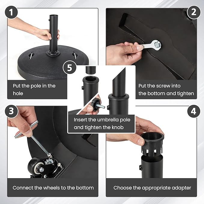 - Installation facile : La base de parasol lestée est facile et rapide à assembler. Il suffit d'installer le poteau de support, de serrer les vis, de fixer les roues, de sélectionner l'adaptateur approprié et de positionner le poteau du parasol et de le fixer à l'aide du bouton. Aucun remplissage d'eau ou de sable n'est nécessaire.