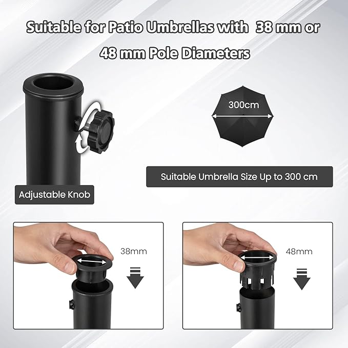 - Convient à différentes tailles de parasols : La base du parasol est équipée d'un poteau de support en métal et est livrée avec deux adaptateurs, ce qui la rend adaptée à la plupart des parasols de marché et des parasols de table de patio. Cette base est idéale pour les parasols d'un diamètre de 300 cm et d'un diamètre de mât de 38/48 mm.