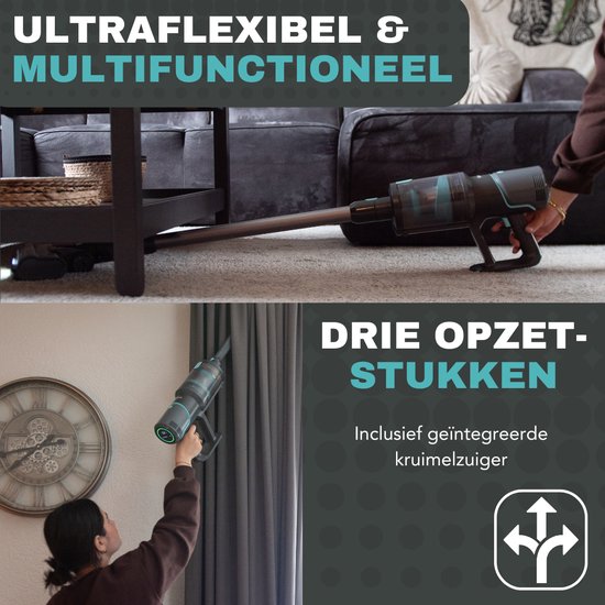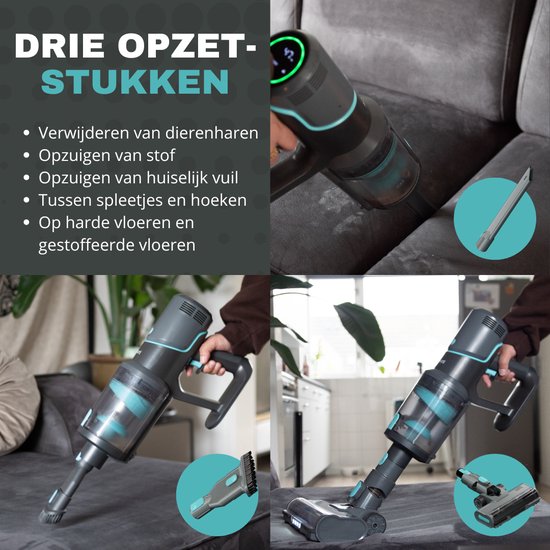 Avec les 4 accessoires inclus et 3 modes différents, cet aspirateur-balai est idéal pour toutes les tâches de nettoyage, de l'élimination des poils d'animaux domestiques à l'aspiration de la poussière et de la saleté sur les sols durs et les tapis. De plus, les pièces sont lavables en machine, ce qui garantit une solution de nettoyage durable et hygiénique.