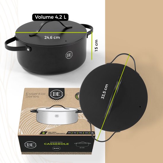BE Living Essential Casserole avec couvercle - Ø 24 cm - Poêle de cuisson - Céramique - Sans PFAS - Induction - Noir