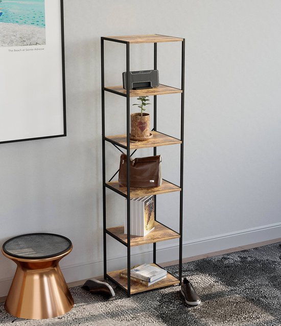 Une bibliothèque contemporaine au design industriel, dotée d'un solide cadre en métal noir et d'élégantes étagères en bois marron. Dotée de 6 étagères et de 5 compartiments ouverts, cette armoire murale offre de nombreuses possibilités et est polyvalente en tant que bibliothèque, armoire murale, classeur, armoire de bureau, armoire de cuisine ou en tant qu'armoire polyvalente pour présenter joliment vos collections ou d'autres objets. Donnez à votre intérieur un look moderne et complétez-le avec ce meuble industriel qui attirera tous les regards dans votre salon, votre chambre, votre bureau, votre cabinet de travail ou dans n'importe quelle autre pièce de votre maison. Dimensions : Largeur 40 cm, Profondeur 40 cm, Hauteur 174 cm. La livraison comprend les instructions de montage et toutes les pièces nécessaires.