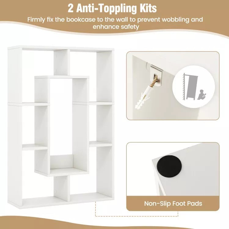 1. Design ouvert pour un accès facile: Avec 7 compartiments de différentes tailles, cette bibliothèque offre des options de stockage et d'affichage polyvalentes. Vous pouvez facilement ranger des livres, des objets décoratifs, des plantes, des photos et des paniers. Le design vertical et la structure ouverte permettent d'utiliser efficacement l'espace disponible et de maximiser le potentiel de stockage.2. Finition parfaite:Le matériau durable du panneau avec des bords épaissis garantit une construction robuste, une forte capacité de charge et une plus longue durée de vie de l'armoire. En outre, les patins antidérapants protègent le sol des rayures. 3. Conception anti-basculement: Grâce aux 2 ensembles anti-basculement, vous pouvez fixer fermement la bibliothèque au mur pour éviter qu'elle ne vacille ou ne bascule, assurant ainsi un environnement sûr pour votre famille. Les bords surélevés empêchent également les objets de tomber des étagères. 4. Assemblage et entretien faciles: Avec les instructions et les pièces nécessaires incluses, l'assemblage est rapide et sans tracas. La surface lisse et facile à nettoyer facilite l'entretien.