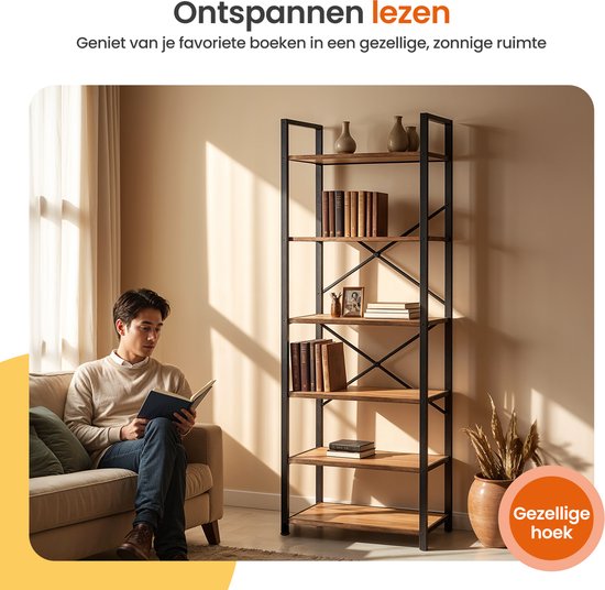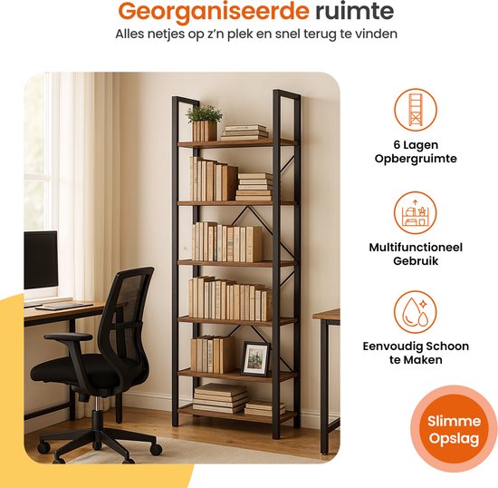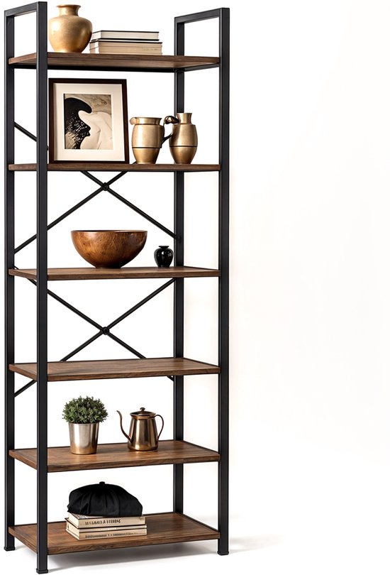 Bibliothèque Goliving - 66 x 30 x 186 cm - 6 niveaux - Meuble de rangement - Meuble mural - Bibliothèque - Meuble d'exposition - Meuble d'étagère - Meuble de salon - Industriel - Marron/Noir