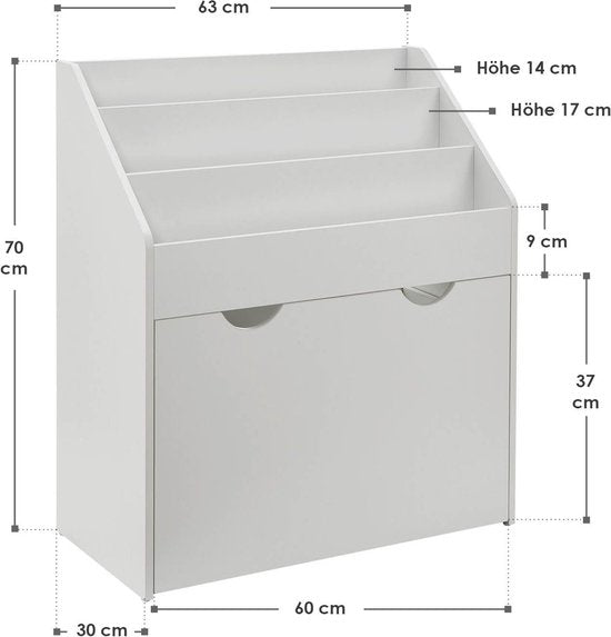 Dimensions (approximatives):Taille totale de l'étagère pour enfants : 63 x 30 x 70 cm (LxPxH)