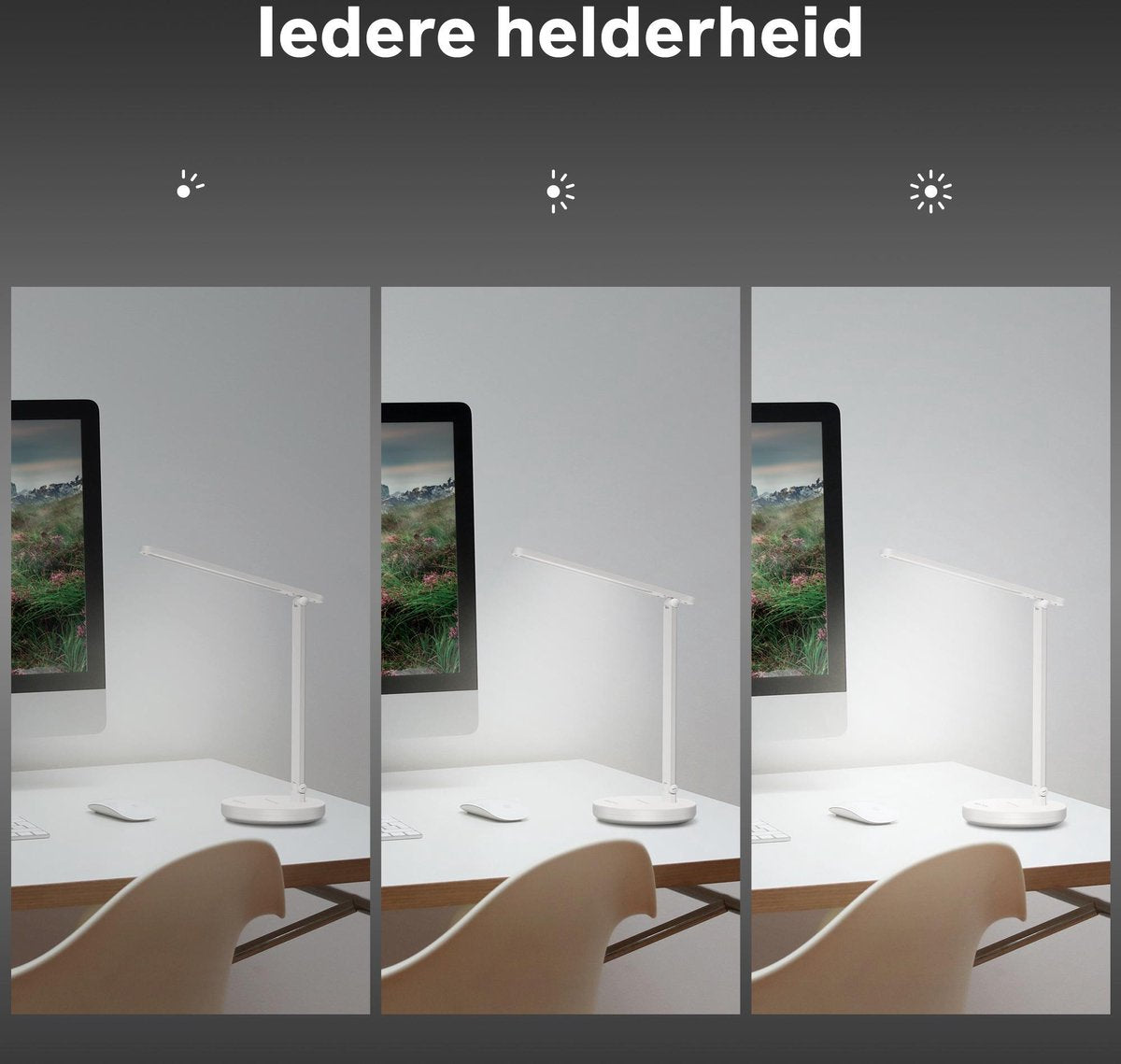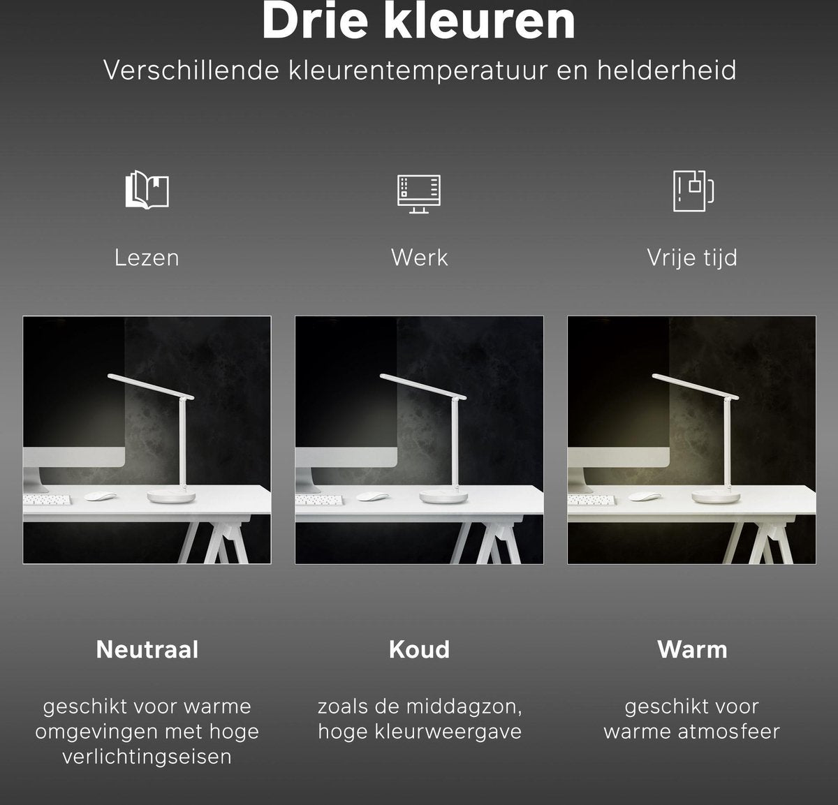 Créëer une atmosphère dépareillée avec la combinaison unique de 3 modes de couleur et de niveaux de luminosité graduables à l'infini. La lampe de bureau DL100 vous offre de multiples combinaisons d'éclairage que vous pouvez utiliser à différentes occasions. Elle dispose en outre d'une fonction intelligente qui mémorise le réglage précédent.