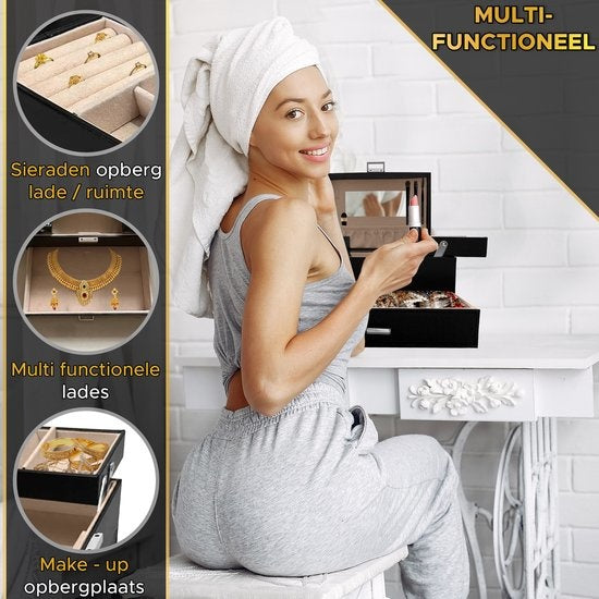 Laboîte à bijoux TOIVO XL est composée de trois couches différentes : 2 tiroirs, 2 compartiments latéraux, plusieurs porte-bracelets et plusieurs plateaux de rangement. Vous pouvez donc littéralement tout garder en un seul endroit !