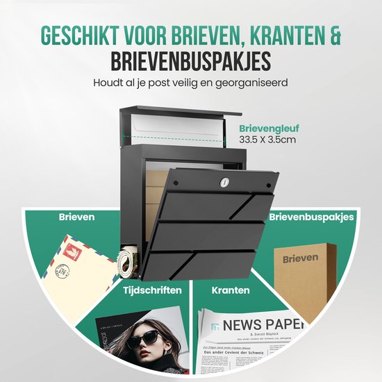 SpécificationsLa boîte aux lettres murale est une boîte à lettres pratique qui permet de séparer le courrier et les journaux de manière optimale.