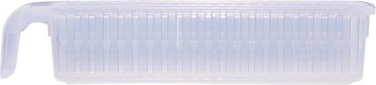 Cette boîte de rangement pratique vous aidera à garder votre réfrigérateur propre et organisé. Cette boîte s'adapte à tous les réfrigérateurs et est parfaite pour ranger les petits contenants, tels que les boissons et les en-cas. Grâce à la cloison située au milieu de la boîte, vous pouvez diviser efficacement votre espace de stockage et classer vos aliments dans différentes catégories, ce qui vous permet d'avoir une meilleure vue d'ensemble dans le réfrigérateur. La boîte de rangement est fabriquée en plastique de haute qualité et dispose d'une poignée robuste. De plus, elle peut être lavée au lave-vaisselle. - Boîte de rangement pour réfrigérateur - vous aide à organiser votre espace - convient au lave-vaisselle Spécifications : Couleur : transparent Matériau : plastique Dimensions : 30,4 x 14,3 x 6,5 cm Capacité : 2 x 0,9 litres Poids : 0,126 kg